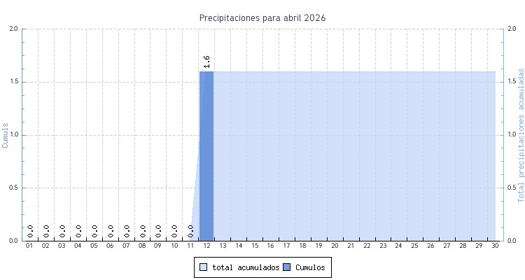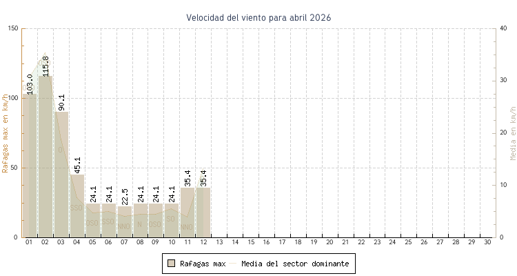 | 01 | 9.7 C a las 04:00 | 17.4 C a las 14:20 | 12.9 C | 30.6 km/h (103.0 km/h) | OSO |