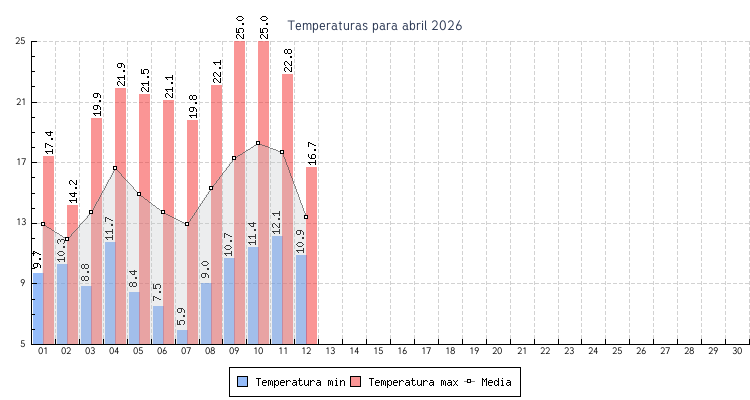 | 11 | 12.1 C a las 07:40 | 22.8 C a las 15:40 | 17.7 C | 3.9 km/h (35.4 km/h) | NNO |