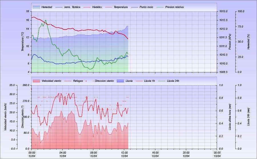 Temperaturas Presión - Humedad Pluviometría Viento Evapotranspiración Gráficos interactivos Datos actuales Efémerides / Móvil Pronósticos Estadísticas Otros Sensores Tendencias Alertas Nuestro Clima Otras Webs Plantillas Info
